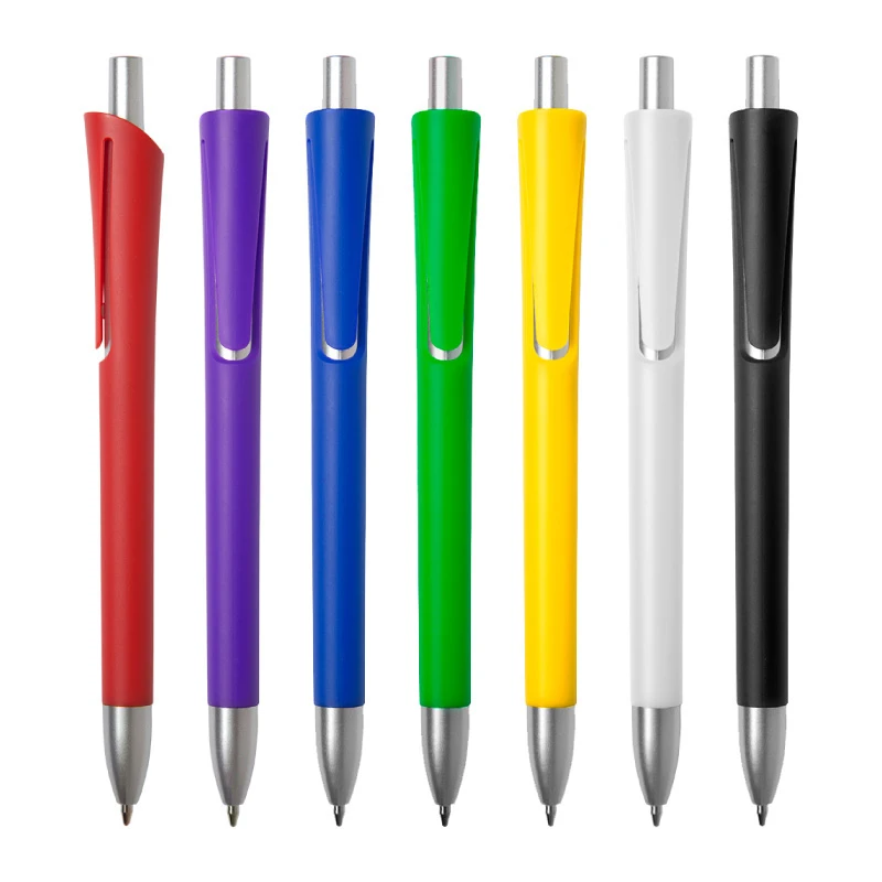Plástico. Bolígrafo con cuerpo plástico de color, botón pulsador y puntera color plata. Tinta negra.