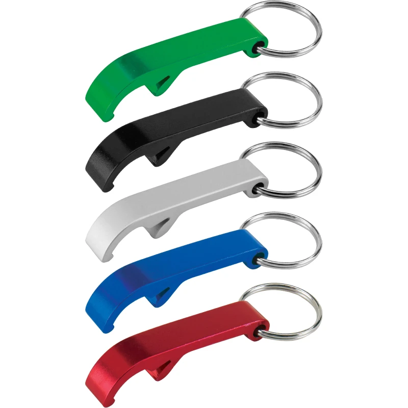 Aluminio. 5,5 x 1 x 1,1 cm. Llavero que permite ser usado como destapador.