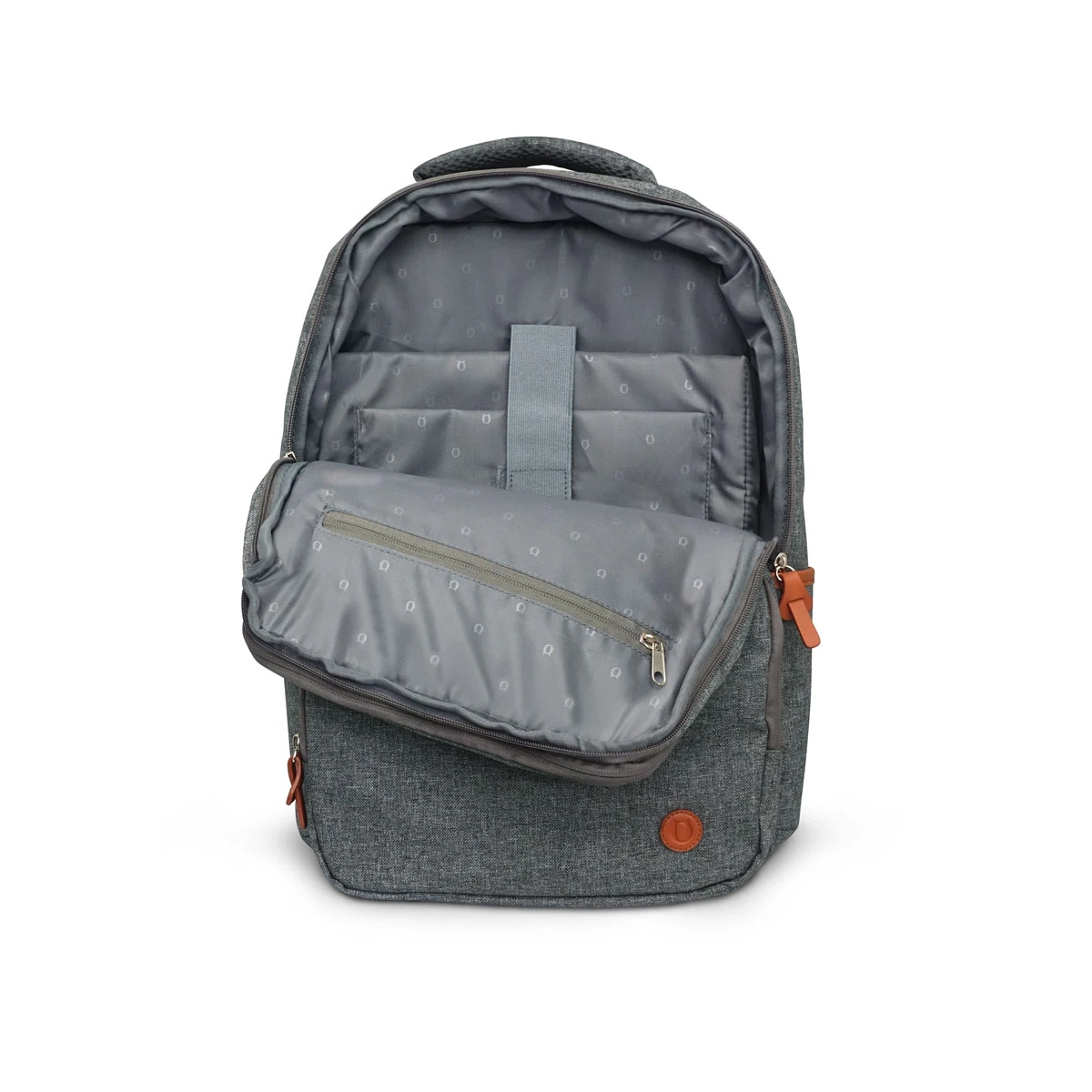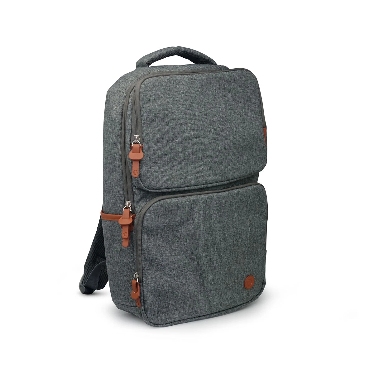 33,5 x 44 x 12,5 cm. Capacidad 11 litros. Poliéster 600D + Nylon + PU. Mochila urbana portanotebook con 2 bolsillos frontales y múltiples compartimentos internos acolchados. Posee espacio para tablet y notebook de 15".
