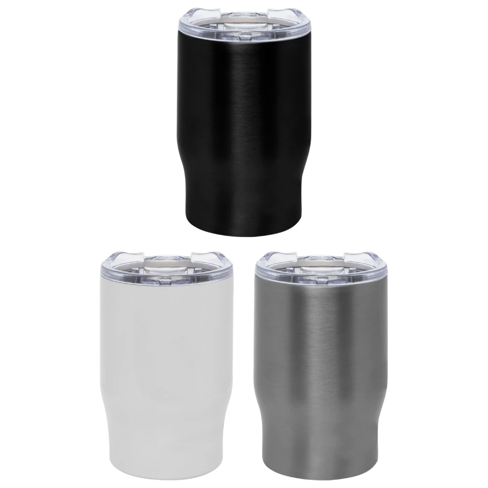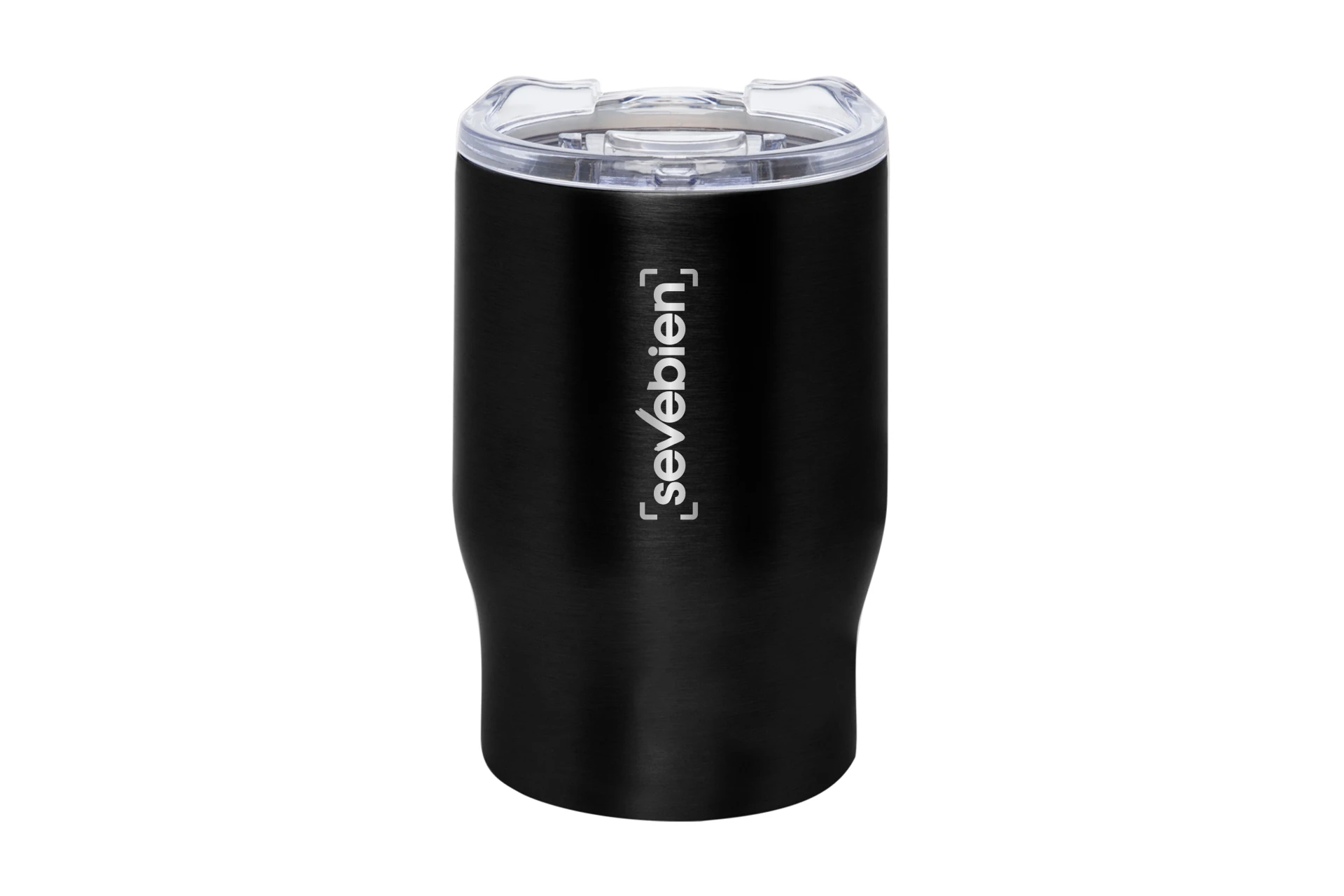 Ø 8,5 x 13,3 cm. Capacidad 350 ml. Acero inoxidable. Mug doble pared. Interior de acero 304 y exterior de acero 201. Tapa plástica transparente a rosca con cierre anti derrame. Mantienen las bebidas frías y calientes por más tiempo. No utilizar con bebidas gaseosas. Presentación en caja de regalo.