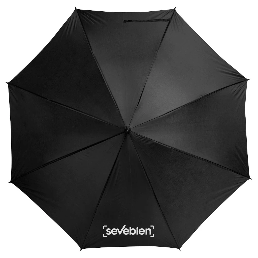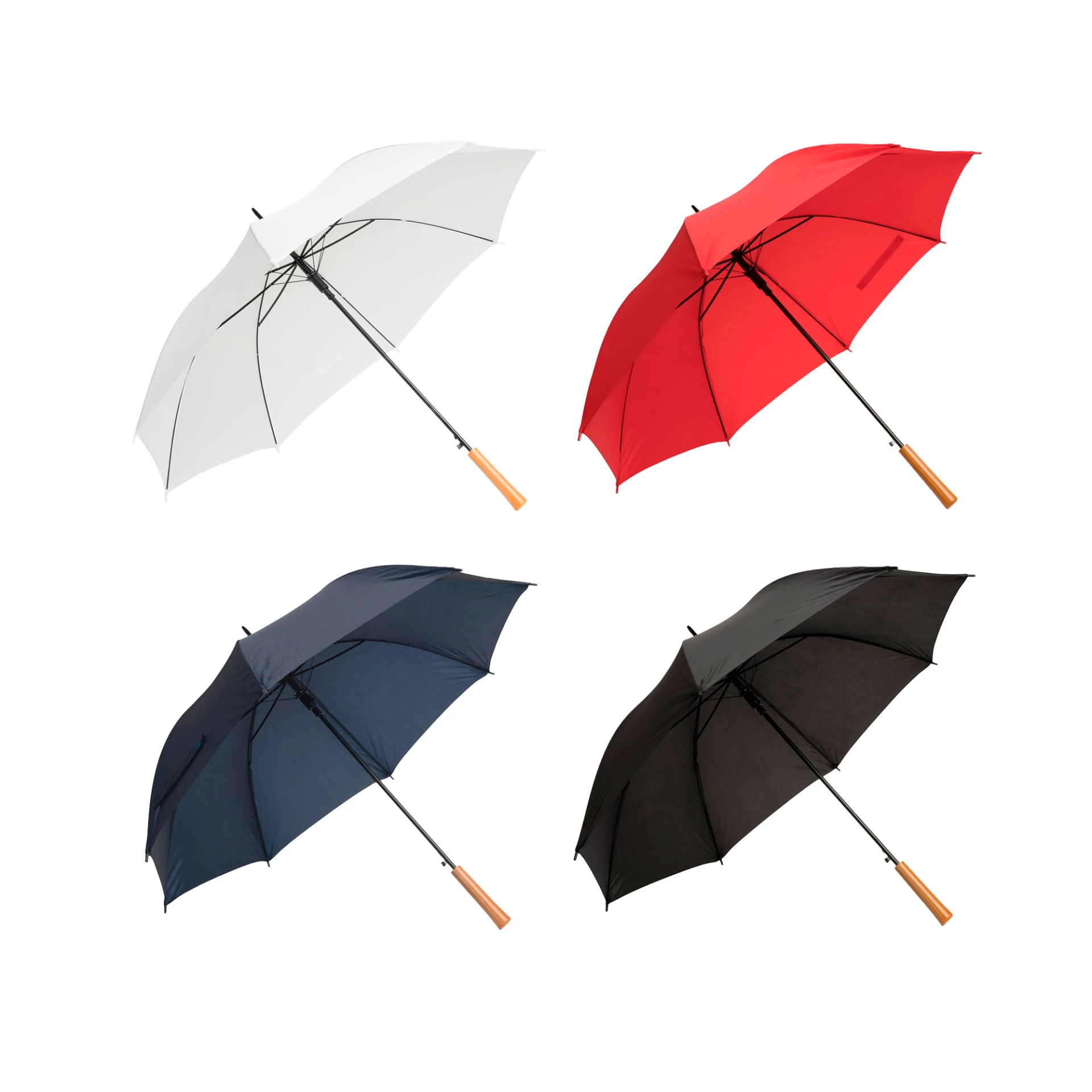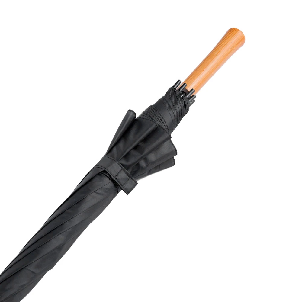 Ø 118 cm. Poliéster. Paraguas APERTURA AUTOMÁTICA Y CIERRE MANUAL. Eje, varillas y punta metálicas, cierre con correa de velcro y mango en PVC, símil madera.