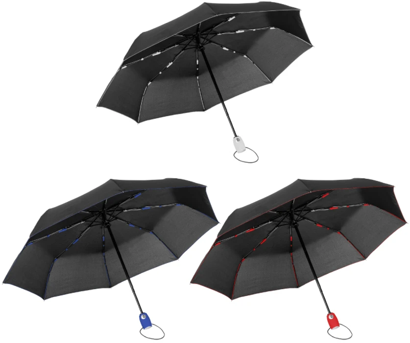 Ø 96 cm. Polyester. Paraguas automático con sistema antiviento. Eje metálico y varillas de fibra de vidrio de color. Mango engomado de color. APERTURA Y CIERRE AUTOMÁTICO. Sujetador elástico. Funda de polyester con costura de color.