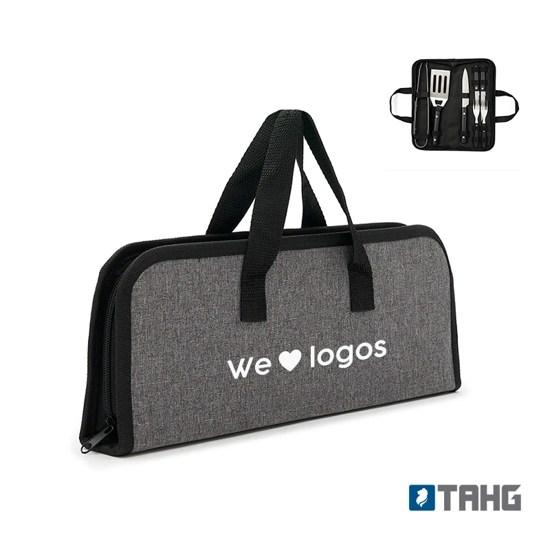 Set de asado con estuche de polyester y nylon color gris. Contiene: 2 juegos de cuchillo y tenedor, 1 pinza, 1 cuchillo asador y 1 espátula. Todas las piezas cuentan con mango de madera. Producto aprobado por el INAL para el contacto con alimentos.