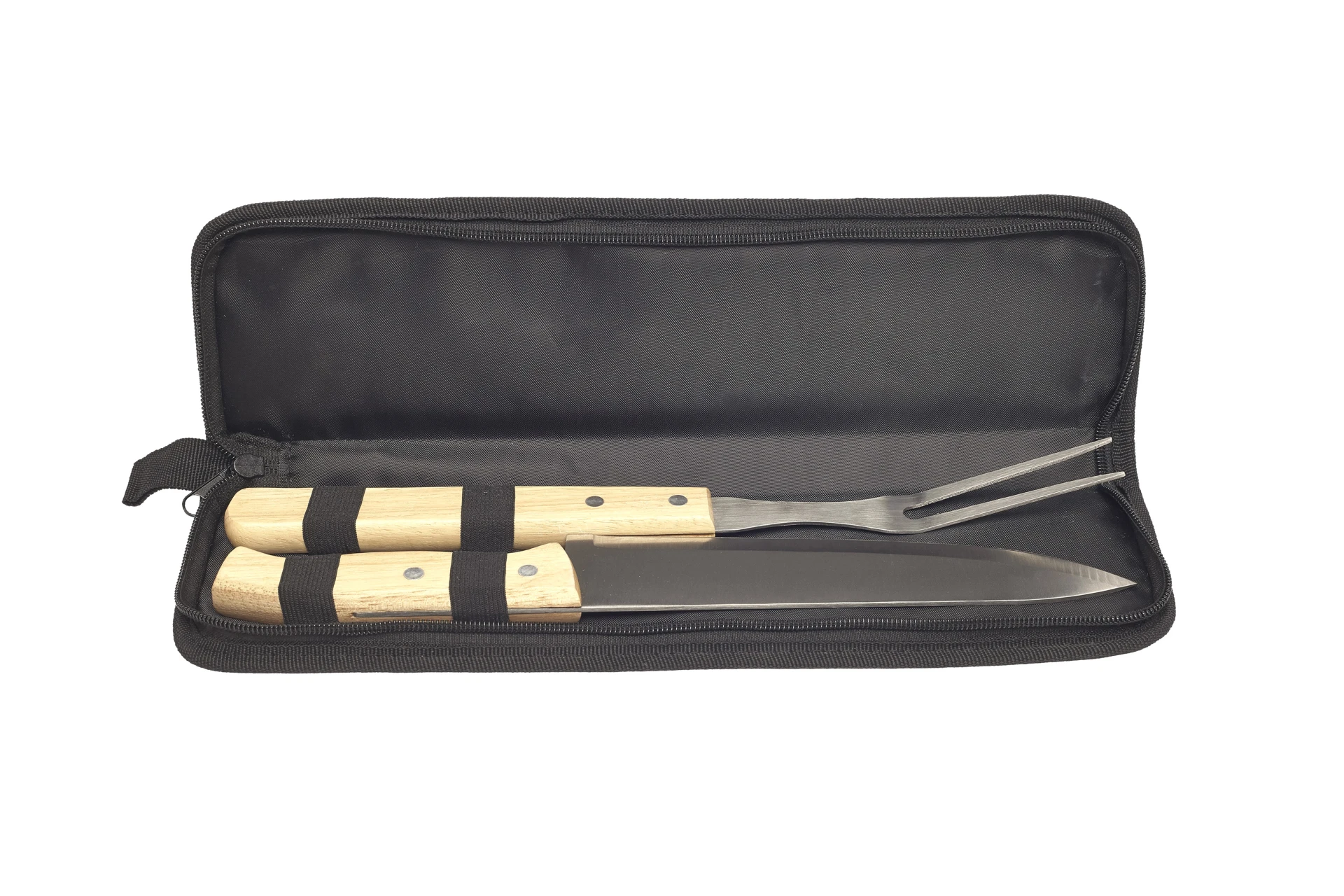 9,5 x 35,5 (estuche cerrado) 20 x 35,5 (estuche abierto). Tenedor: 33 cm y cuchillo: 32,5 cm. Set de cuchillo y tenedor con mango de madera. Estuche de polyester con cierre. Presentación en caja de regalo.