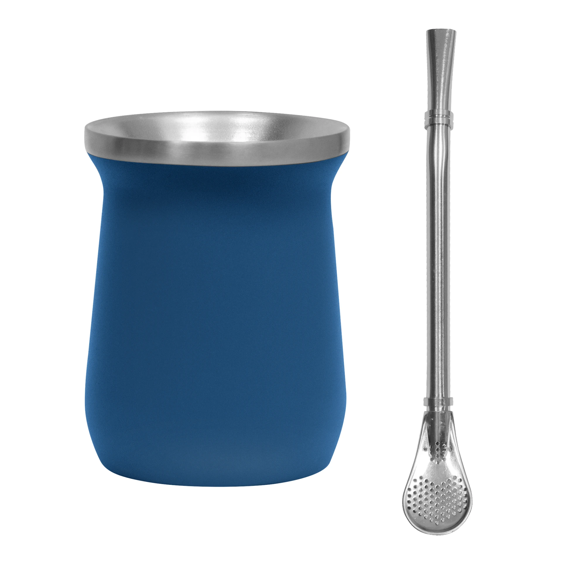 Ø 8 x 10,8 cm. Capacidad 300 ml. Mate Mug doble pared. Interior de acero 304 y exterior de acero 201. Mantiene la temperatura por más tiempo. Pintura Powder Coat (pintura mas duradera y resistente a la corrosión y el paso del tiempo). Bombilla de acero inoxidable 304 de 15,5 cm. Presentación en caja de regalo Kraft.